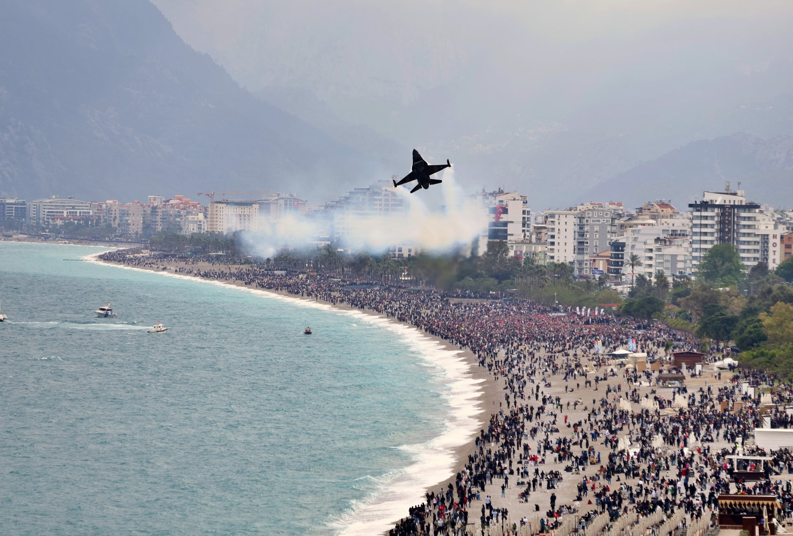 Saatler öncesinden kamp sandalyeleri ve bayraklarıyla sahile yerleşen Antalyalılar, SOLOTÜRK pilotlarının imkansızı zorlayan manevralarını heyecanla takip etti. F-16 uçağının gücünü ve pilotların ustalığını sergileyen alçak uçuşlar sırasında vatandaşlar o anları cep telefonlarıyla ölümsüzleştirdi.