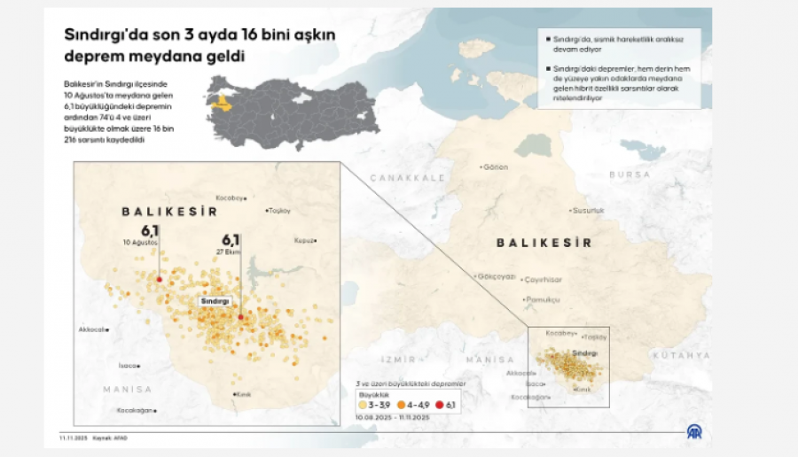 Balıkesir’de 10 Ağustos ve 27 Ekim’deki 6,1’lik iki depremden bu yana 17 bini aşkın deprem meydana geldiğini belirten Okan Tüysüz, “Bu sabah Sındırgı’nın içinde bir tane 4,7’lik, iki tane de 4,2’lik deprem oldu. Dün sabahtan bu sabaha kadar 228 deprem oldu. Yani deprem fırtınası sürüyor. Dün bir miktar sakinleşmişti ama bugün yine aktif. Çok sayıda 2 ve 3 arası deprem de var.” dedi.