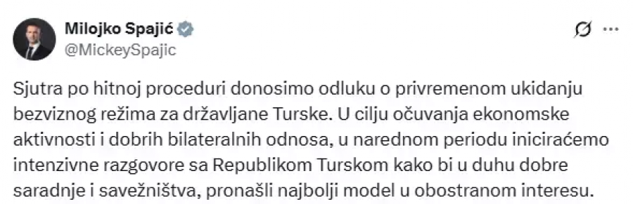 Spajic, X hesabından yaptığı açıklamada “Türk vatandaşları için vizesiz rejimin geçici olarak askıya alınmasına ilişkin kararı acil bir prosedürle alacağız. Ekonomik faaliyetlerin ve iyi ikili ilişkilerin korunması amacıyla, önümüzdeki dönemde Türkiye Cumhuriyeti ile yoğun görüşmeler başlatarak, iyi iş birliği ve müttefiklik ruhu içinde her iki tarafın da çıkarına olacak en uygun modeli bulmaya çalışacağız” ifadelerini kullandı.