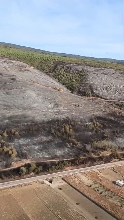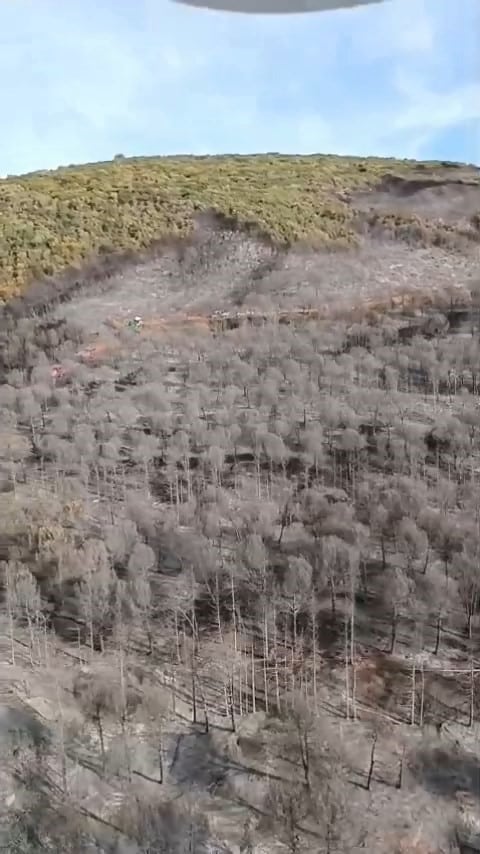 Yaklaşık 16 saatin sonunda söndürülen alevlerden geriye kalan, küle dönmüş alan soğutma çalışmalarına katılan helikopterden böyle görüntülendi.
