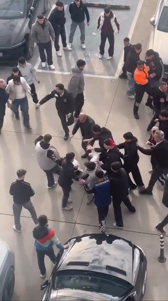 Bir kişiyi ortalarına alan gençler, yerde yatan gence peş peşe tekme attı.
