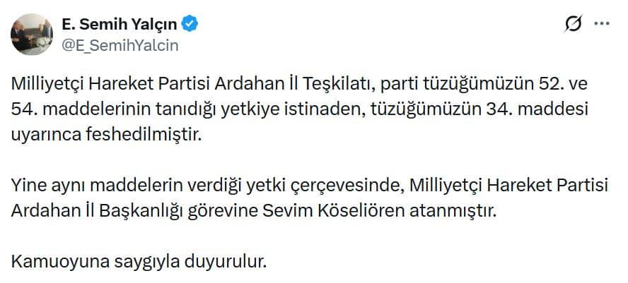 Milliyetçi Hareket Partisi (MHP) Genel Başkan Yardımcısı Semih Yalçın, partinin yerel yapılanmasındaki bu önemli değişikliği sosyal medya hesabı üzerinden paylaştı. Yalçın, Ardahan İl Teşkilatı’nın parti tüzüğündeki ilgili maddelere dayanarak feshedildiğini açıkladı.