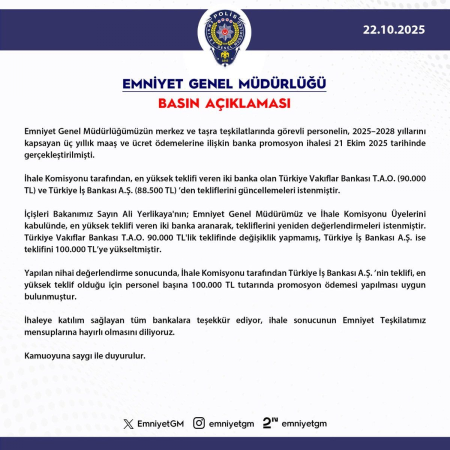 Emniyet Genel Müdürlüğü, 2025-2028 yıllarını kapsayan üç yıllık maaş ve ücret ödemeleri için düzenlediği banka promosyon ihalesinin sonuçlarını açıkladı.