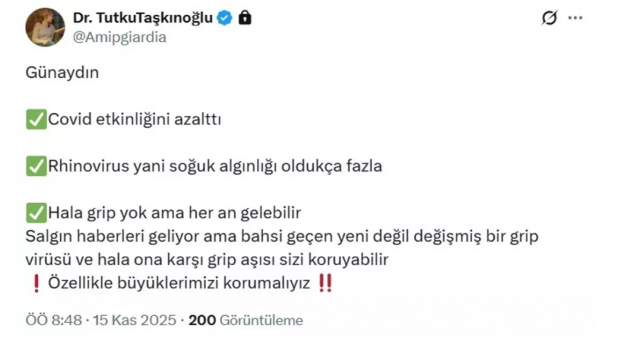 Dr. Tutku Taşkınoğlu salgın haberlerine yönelik, “Salgın haberleri geliyor ama bahsi geçen yeni değil değişmiş bir grip virüsü ve hala ona karşı grip aşısı sizi koruyabilir” dedi.