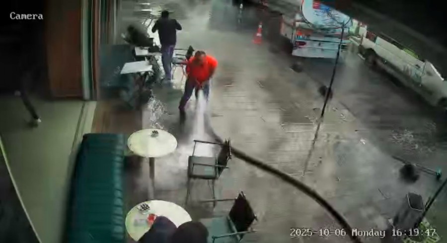 Tazyikli suyun azizliğine uğrayan işletmeci bir süre sonra hortumun kontrolünü kaybetti. Şov yapayım derken tazyikli suyun azizliğine uğrayan esnaf, o esnada kafe önünde çay içen müşterilerini ıslattı. Ne olduğunu anlamaya çalışan müşteriler kaçışırken, yaşanan o anlar güvenlik kamerasına yansıdı.